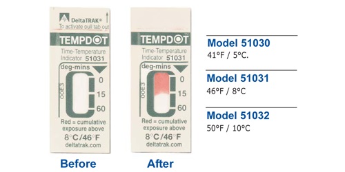 DeltaTrak提供滿足你各種需要的標(biāo)簽:WarmMark溫度標(biāo)簽、高溫?zé)針?biāo)簽和TempDot時間溫度指示標(biāo)簽顯示溫度變 化超過預(yù)設(shè)的時間。FreezeCheck和ColdMark溫度標(biāo)簽用于顯示運(yùn)輸溫度低于0℃。商業(yè)洗碗機(jī)使用的TempDot高溫?zé)針?biāo)簽可顯示最終沖 洗水溫是否達(dá)到71℃(HACCP體系所要求的溫度)。 TempDot時間溫度標(biāo)簽,,型號51030-51032,,是一種低成本的標(biāo)簽,,可顯示溫度高于閾值長達(dá)60分鐘。當(dāng)溫度超過臨界值,,標(biāo)簽顏色變化開始,,但溫度下降到閾值之下時,,標(biāo)簽顏色變化停止,如此來顯示累積溫度超過的時間-,,對于許多質(zhì)保應(yīng)用來說,,度分鐘是非常的重要的概念。有三種溫度閾值5℃、8℃和10℃可供選擇。 這個低成本標(biāo)簽可以指示一段長到60分鐘暴露在臨界點(diǎn)溫度。